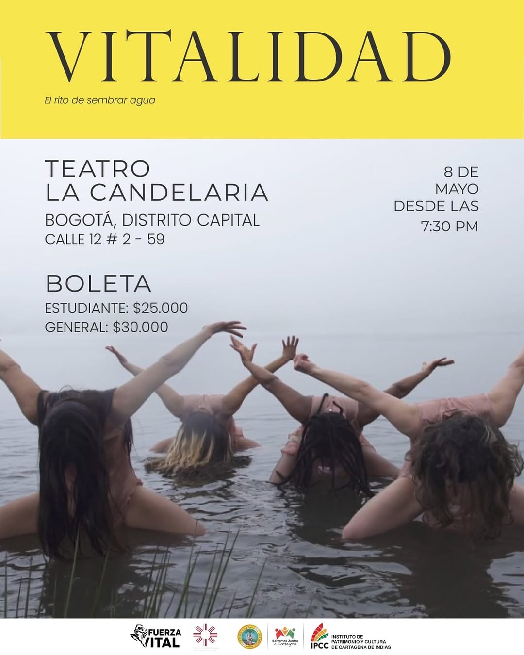 VITALIDAD El rito de sembrar agua es una propuesta teatral y audiovisual que se presenta en el Teatro La Candelaria en Bogotá. La obra explora la relación entre el agua y la mujer como metáfora de origen, recorriendo simbólicamente páramos, lagunas, ríos y el mar colombiano. Es una experiencia escénica íntima y poética que invita a reflexionar sobre el territorio, la memoria y la fuerza vital del agua.