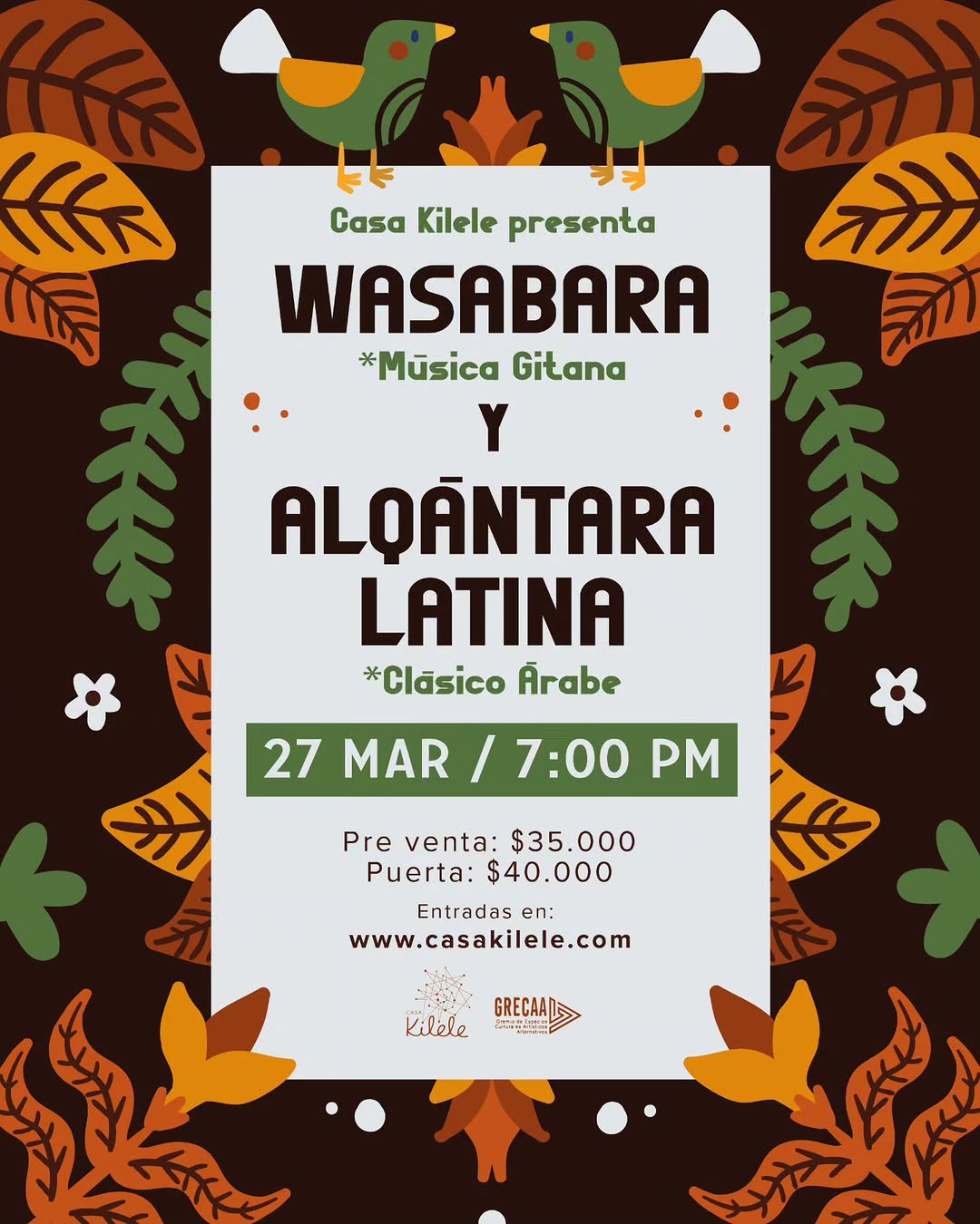 WASABARA Música Gitana y ALQANTARA LATINA Clásico Árabe es un concierto en Casa Kilele que reúne sonoridades balcánicas, árabes, gitanas y latinas en Bogotá. El ensamble Wasabara fusiona influencias de India, Turquía, Bulgaria y Rumania con matices klezmer y latinoamericanos, mientras Alqántara Latina interpreta repertorios clásicos del mundo árabe. Una noche íntima para viajar por diferentes culturas a través de la música en vivo.