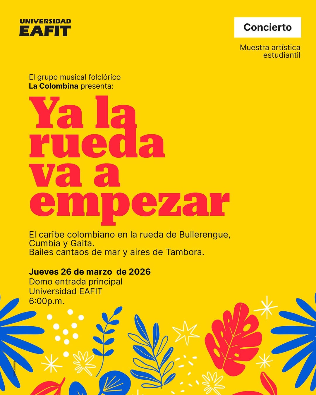 Ya la rueda va a empezar es una muestra artística estudiantil en formato de concierto folclórico en la Universidad EAFIT, en Medellín, a cargo del grupo La Colombina. El público podrá disfrutar y bailar ritmos del Caribe colombiano como bullerengue, cumbia y gaita, con cantos tradicionales de mar y aires de tambora que resaltan las raíces culturales del país en un ambiente cercano y festivo.