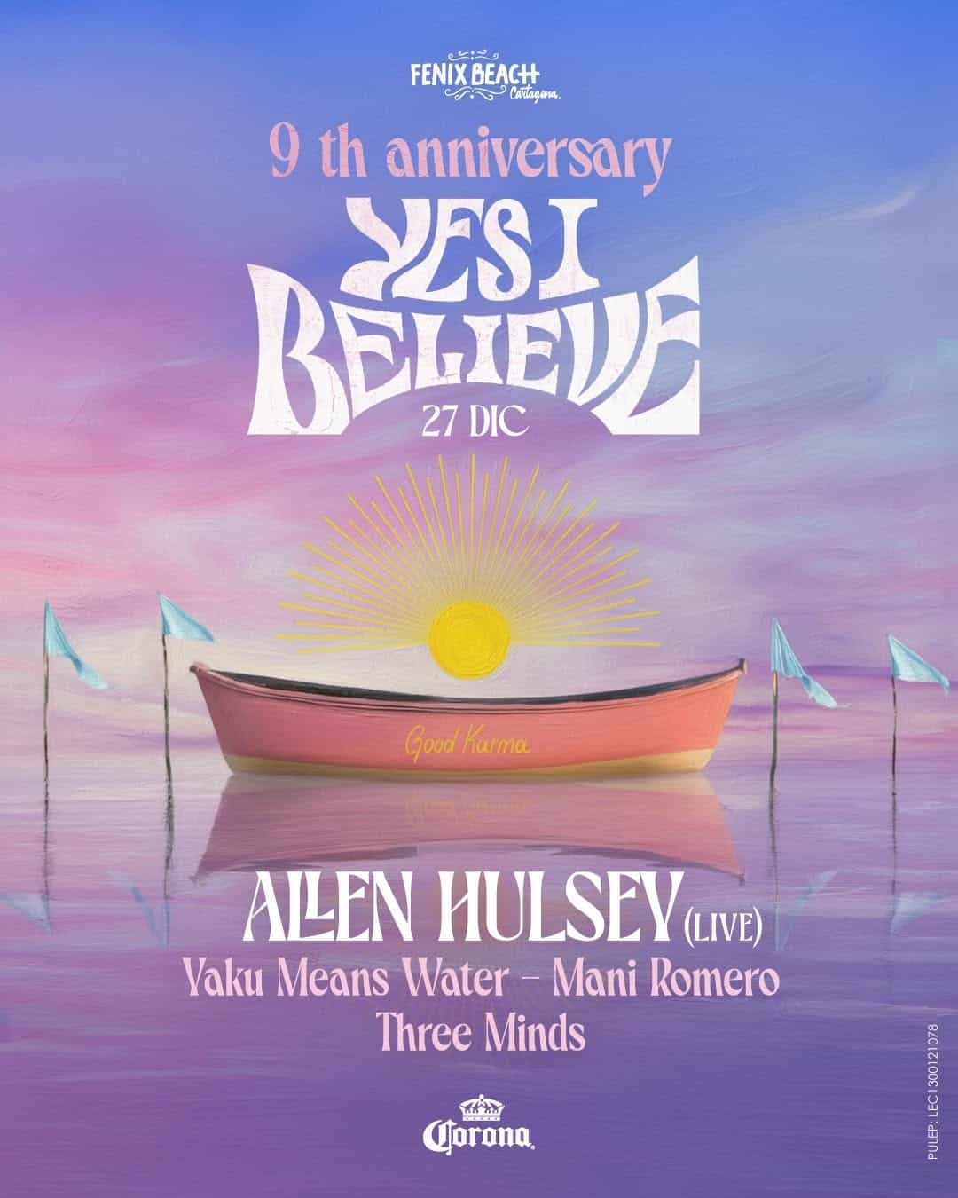 Prepárate para una celebración única en la playa Fénix de Cartagena. El 9º aniversario de Yes I Believe promete una fiesta inolvidable bajo el sol, con una energía renovada. Disfruta de la música en vivo de Allen Hulsey, Yaku Means Water, Mani Romero y Three Minds. Un evento especial patrocinado por Corona que no querrás perderte.