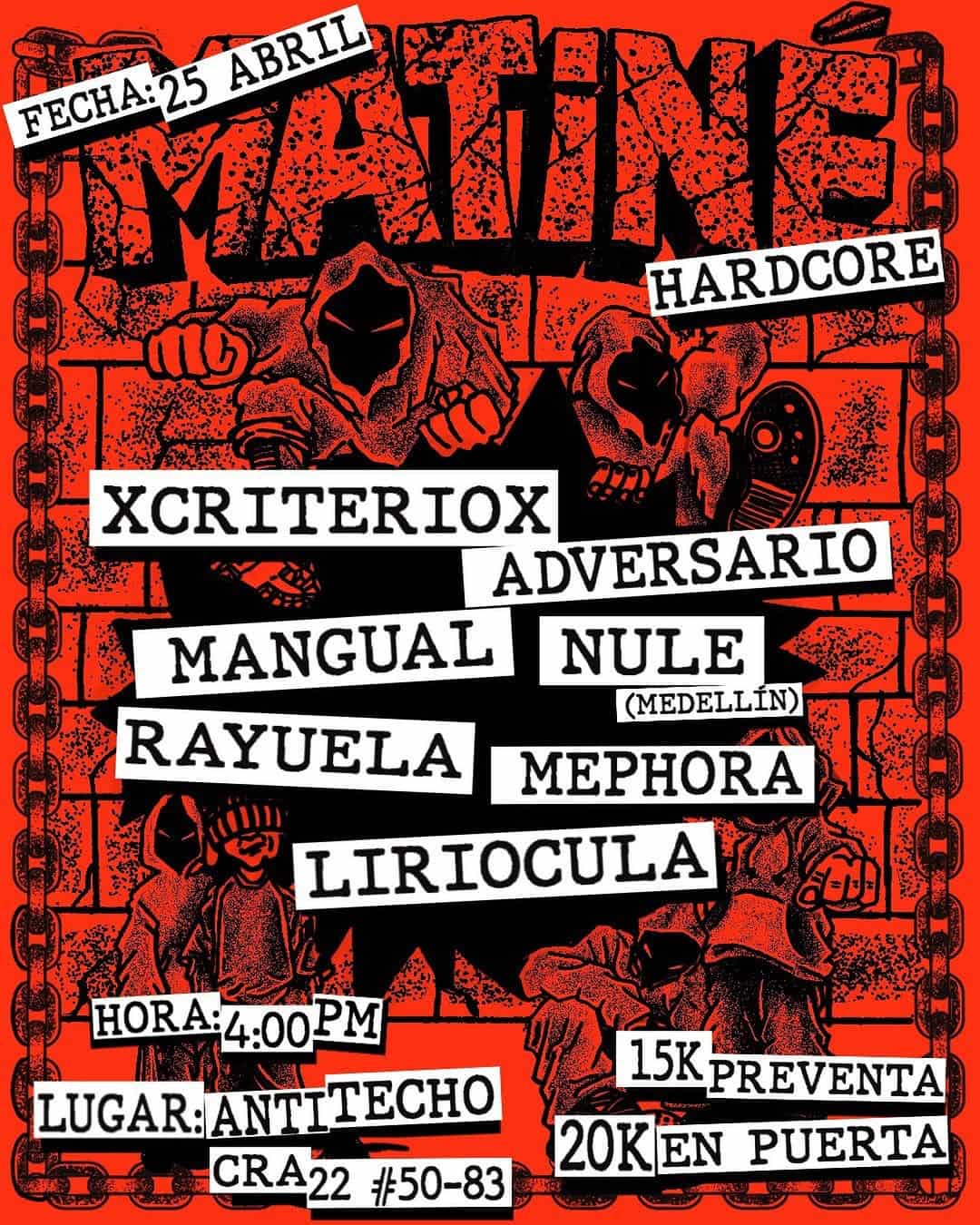 IMAGINE HARDCORE es una matiné de concierto hardcore en Bogotá que reúne a varias bandas de la escena local y a NULE desde Medellín, en el espacio Antitecho. Será una jornada intensa de mosh, stage diving y energía lado a lado, pensada para todo el parche y apta para todas las edades, con un ambiente DIY y comunitario. Ideal para quienes buscan vivir el hardcore en vivo y apoyar proyectos como XCRITERIOX y la movida underground de la ciudad.