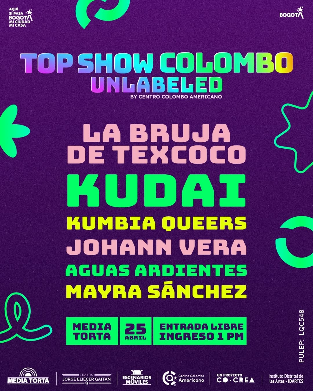 TOP SHOW COLOMBO UNLABELED 第六届音乐节将在波哥大 La Media Torta 举行,以露天音乐会的形式庆祝多元文化和无国界音乐。届时,观众将有机会在同一舞台上欣赏 Kudai、La Bruja de Texcoco、Kumbia Queers、Johann Vera、Mayra Sánchez 和 Aguas Ardientes 等乐队的现场演出。这场音乐盛会提供了一个没有标签的空间,是那些渴望在城市中体验包容、充满活力的另类音乐的人们的理想之选。